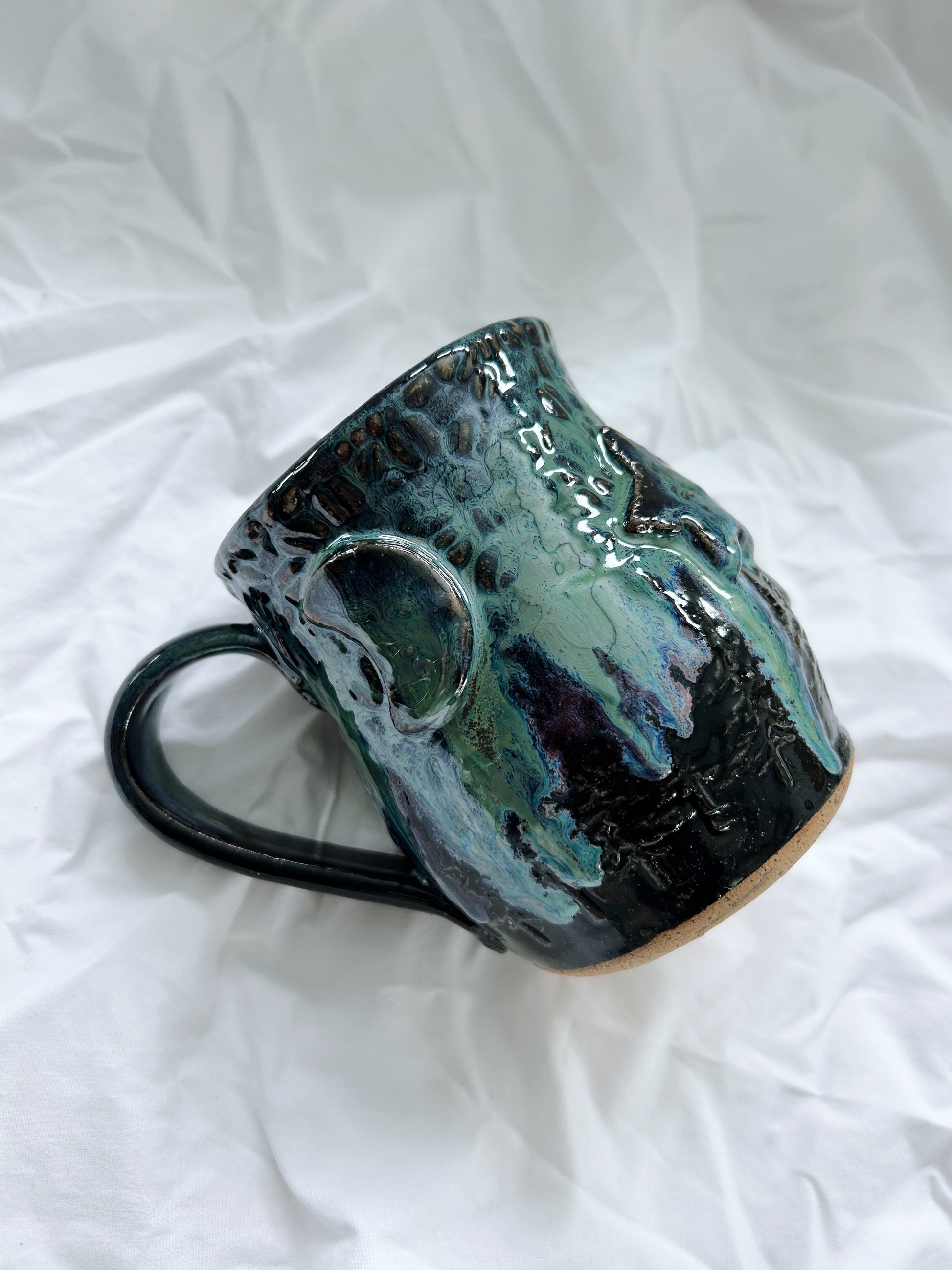 We have been trying to get a consistent Northern Lights glaze for over a year now, and this might be the one! Super happy with the coloration on this pretty "moon and stars" mug